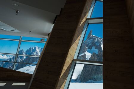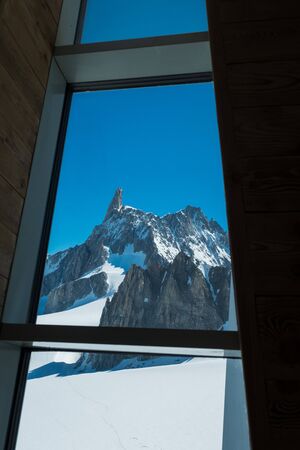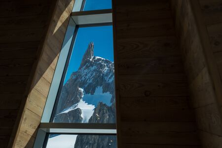 The Dente Del Gigante shooted between architectural elements in the clabeway station of Punta Helbronner in a sunny day with blue sky