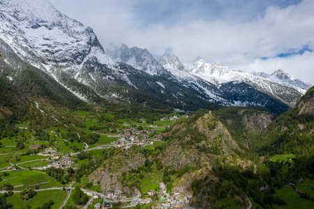 A traditional mountain village is nestled among green hills and forested slopes beneath dramatic snow-capped peaks in Val dAoste, Italy. The landscape features rugged terrain, scattered houses, and a mix of sunlight and drifting clouds in the Alps.