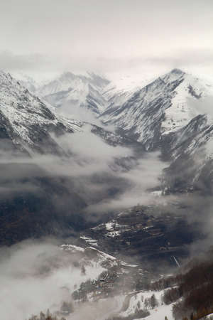 Italy, Aosta Valley, Courmayeur, view from the Mont Blanc cable car. The Skyway cable car connects the city of Courmayeur to Pointe Helbronner (3,466 m) in the Mont Blanc massif.