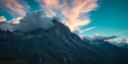 Mountain peak with clouds, sunset
