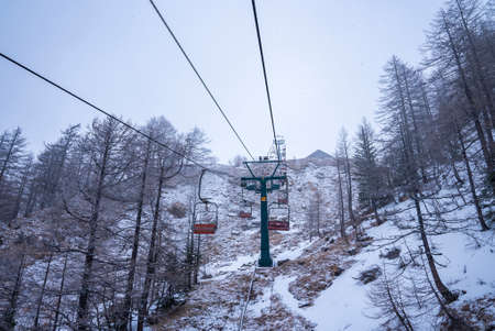 Chair lift on the european alps in summer. Vacation and hiking concept. Macugnaga and the Anzasca valley view from the Belvedere , Piedmont, Italy