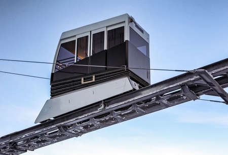 Crans Montana, Valais Canton, Switzerland - 15 July 2023: One red Swiss funicular from Sierre to Crans Montana. Public transport cable railway with scenic view over the city and mountain.