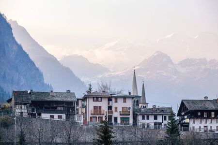 Several houses among the mountains in the early morning. You can see the lid of the church. There is snow in the mountains, the sun is shining.