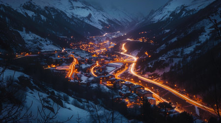 Looking down from above the mountain village is a glowing oasis thanks to the countless car light trails that intersect its streets