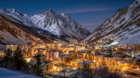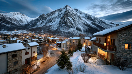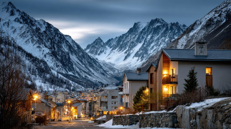 A tranquil winter village nestled among majestic snowy mountains, illuminated by soft evening lights. Perfect for showcasing serene nature scenes.