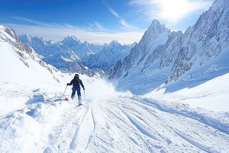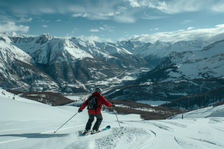 Skier Descending a Snowy Mountain Pass with a Panoramic View of the Alps