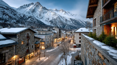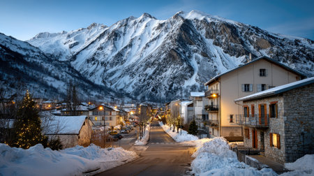 Captivating winter scene featuring a charming town nestled at the base of majestic snow-covered mountains, illuminated by dusk light.