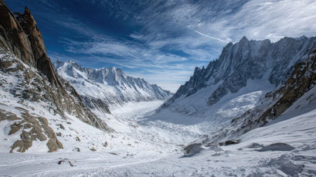 Explore this breathtaking snowy mountain landscape featuring dramatic peaks and a serene valley under a clear blue sky, capturing winter's tranquil essence.