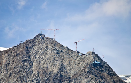 Cranes and building equipment on top of a mountain for high altitude construction