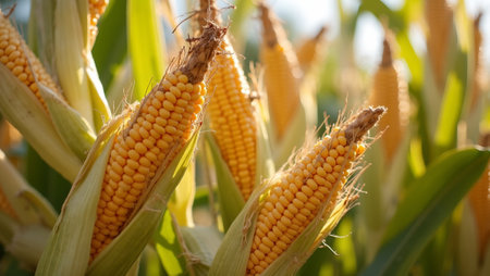 Ripe corn on the cob in the field, ready for harvest