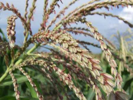 Golden Proso millet Panicum miliaceum ripe seedhead in the summer field blue sky plant Moldova