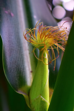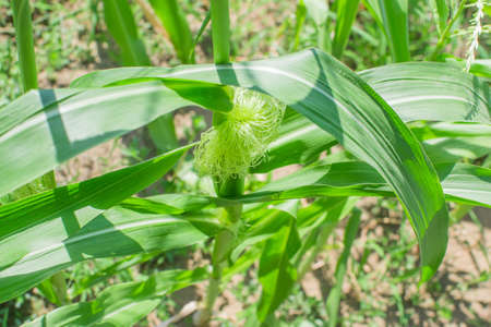Corn stigmas on young cobs among foliage in an agricultural field. Corn silk. Israel