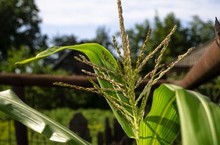 Flowers of corn in the vegetable garden in summer. Close-up