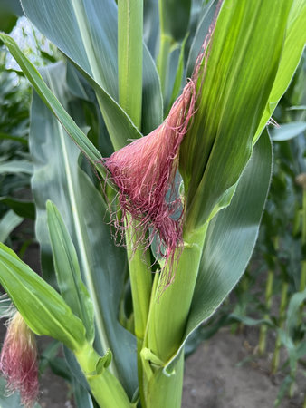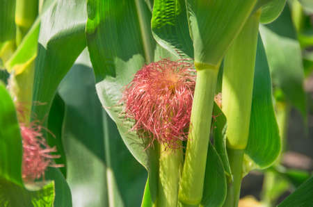 Closeup of cornfield with corn ear and silk growing on cornstalk. Concept of crop health, pollination and fertilization