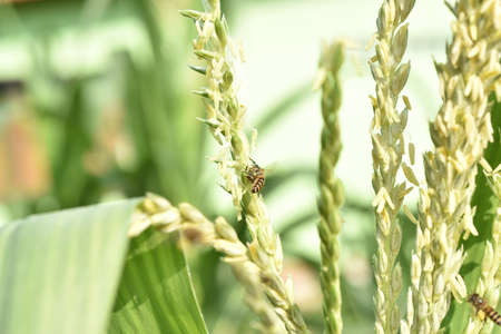 Green Jasmine rice, rice berry rice with barley field local plant of Thai style, Thailand agriculture products. Natural color mode design. Selective focus and blur background.
