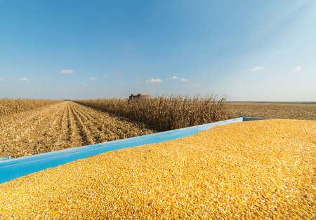 Corn grains in tractor trailer after harvest