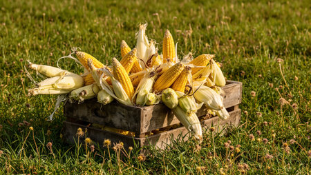 Fresh corn cobs in wooden crate on grassy field sunlight illuminating yellow kernels