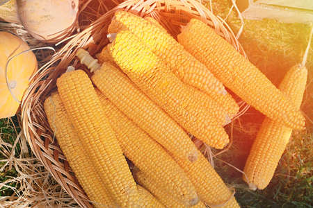 Big juicy corn in a wicker basket. Healthy nutrition.