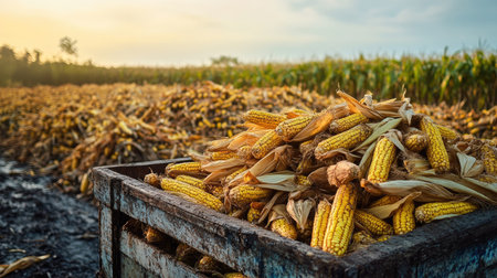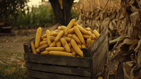 Fresh organic corn in a wooden box standing on a corn field. Successful harvest of sweet corn.
