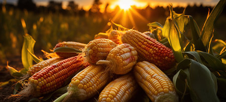 Corn cobs on the background of a cornfield in the sunlight at sunset.