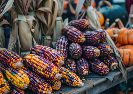 Colorful heirloom corn displayed at a rustic market alongside pumpkins, showcasing autumn harvest and natural beauty. Vibrant colors evoke seasonal warmth and abundance.