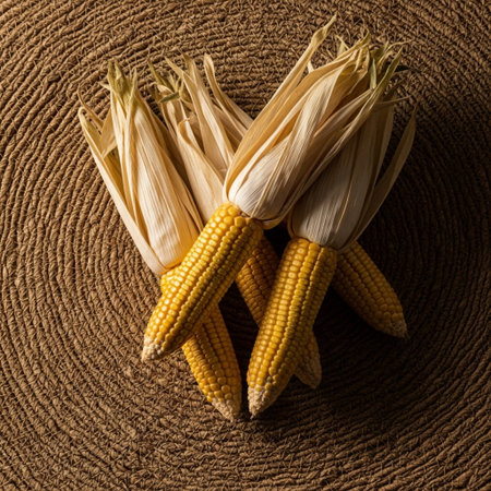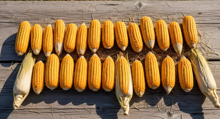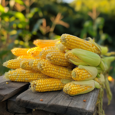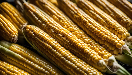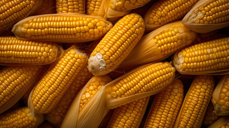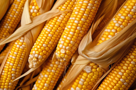 Close-up shot of fresh corn cobs, showing their vibrant yellow kernels and the texture of the husks. The image evokes a sense of freshness and abundance.