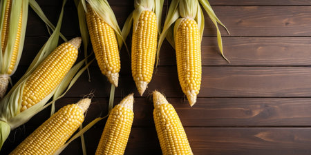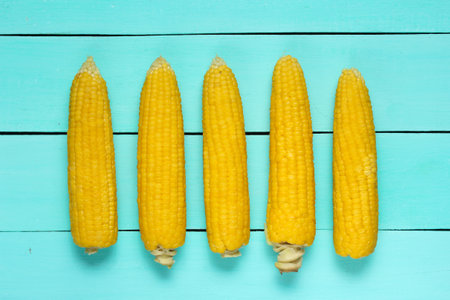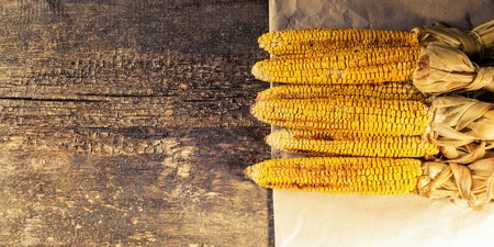 Boiled corn on the cob on a rustic table. Close-up. Copy space. Top view