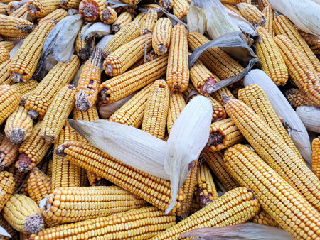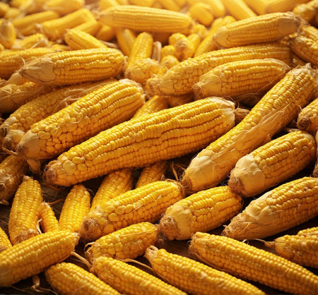 Corn on cobs closeup. Grains of ripe maize. Suitable for background. Forage mealies seed. Export and import of grain.