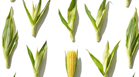 Fresh corn on cob with husk on white, flat lay, top view. Vegan food, agriculture