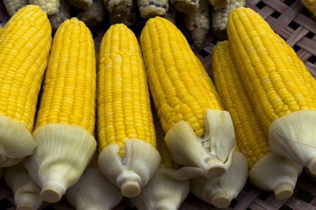 Boiled sweet corn lay on threshing basket.Top view shot.