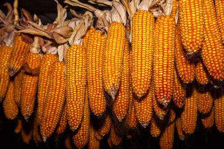 Dried corn cobs. Dried Corns hanging on rustic wall close up