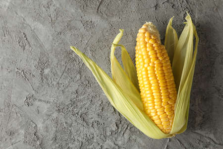 Peeled raw corn on a gray concrete background.