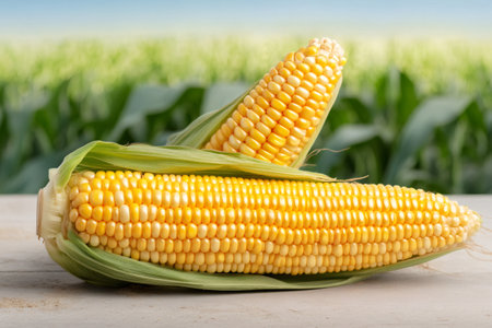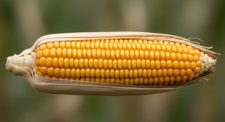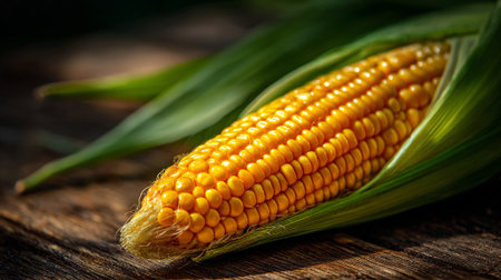 A vibrant closeup of fresh corn on the cob showcasing its golden kernels and green husks. Perfect for agricultural, food, or culinary themes.