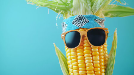 A charismatic ear of corn with a summer bandana and cool shades a vivid backdrop. Generative AI