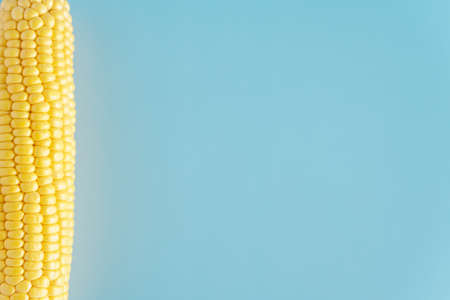 Raw big corn on a blue pastel background. Autumn harvest concept. View from above.