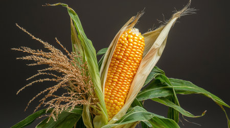Young corn cob with green husk peeled back, exposing the golden kernels, on a dark background for a striking contrast. --chaos