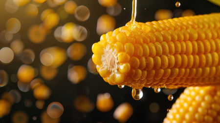 Explore the beauty of fresh yellow corn shown in close-up with glistening droplets against a blurred background, capturing the essence of nature and vibrant farm life.
