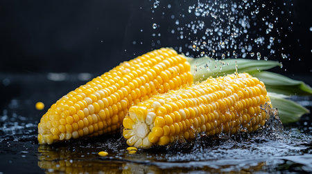 Two ears of fresh corn on the cob, splashed with water droplets on a black background.