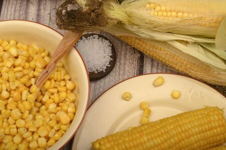 Grains of sweet corn in a plate with a wooden spoon, coarse salt and ears of corn on the table. Healthy diet. Fitness diet. For a sweet treat. Close up.