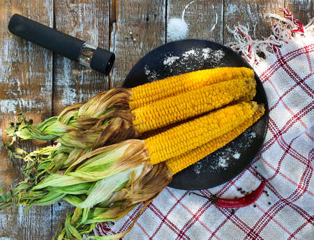 Boiled corn on the cob on a rustic table. Close-up. Copy space. Top view