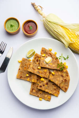 Sweet corn stuffed paratha or parotha served in a plate, Indian flatbread recipe made filling makai