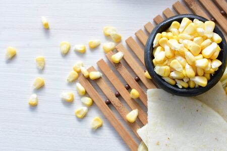 Close up photo of marinated corn seeds on white background