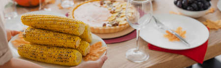 Cropped view of african american woman holding baked corn near festive dinner, banner