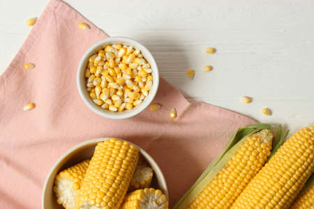 Boiled yellow sweet corn on a white background. Texture. Creative food. Swings of corn. Whole and portions of corn. Ecological food concept. Selective focus.