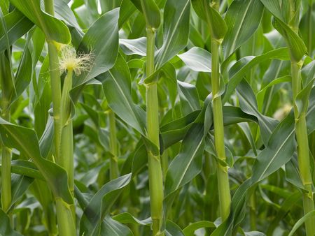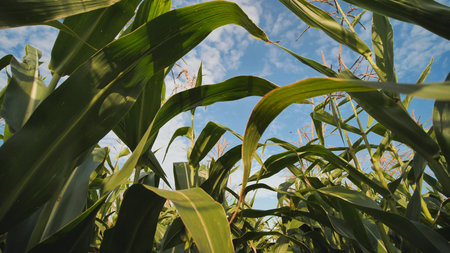 Corn leaves in natural green tones captured from side angle in dense crop plantation