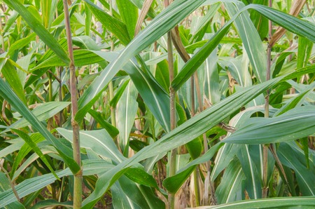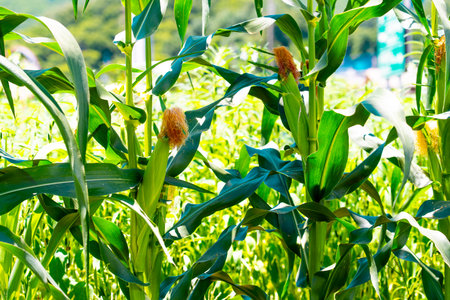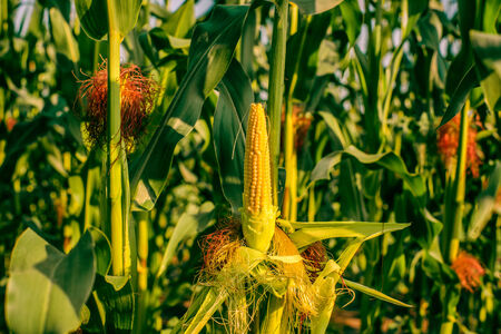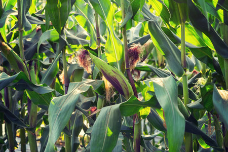 Corn cobs in corn plantation field. Corn plants growing in summer.