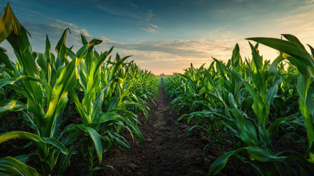 Golden hour sunset over lush green corn field in the tranquil rural countryside