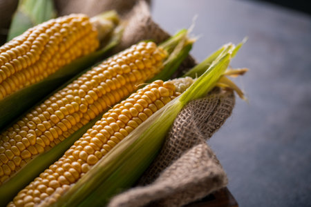 Close up shot of corn cobs, yellow grains of maize. Agriculture and healthy eating concept.