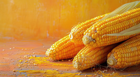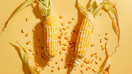 Vibrant ripe corn cobs with scattered kernels on a sunny yellow backdrop, epitomizing summer's bounty. A.I.