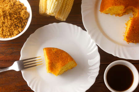 sliced corn cake on white plate on rustic wooden table for breakfast. Typical Brazilian food. Top view